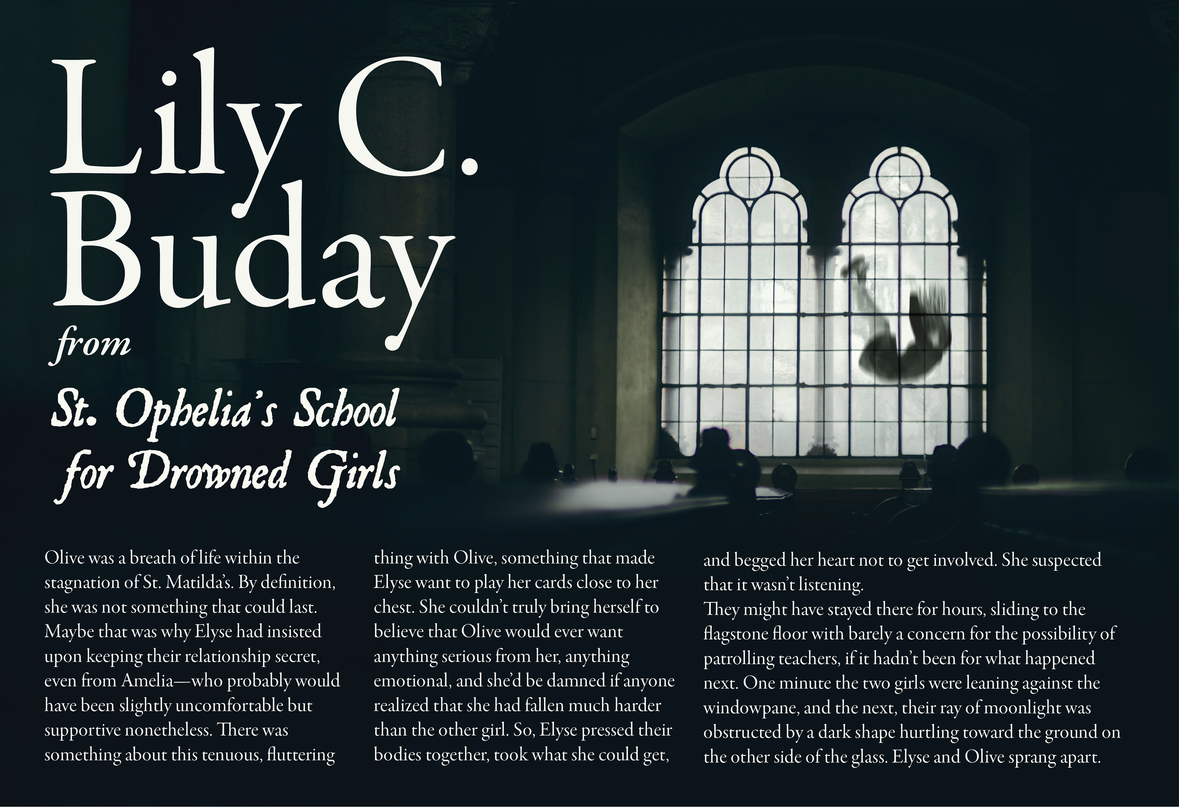 The first emphasizes realism, combining an image of a chapel with figure of a falling woman. This dramatic composition mirrors the excerpt, where two girls watch from within a chapel as a figure falls.