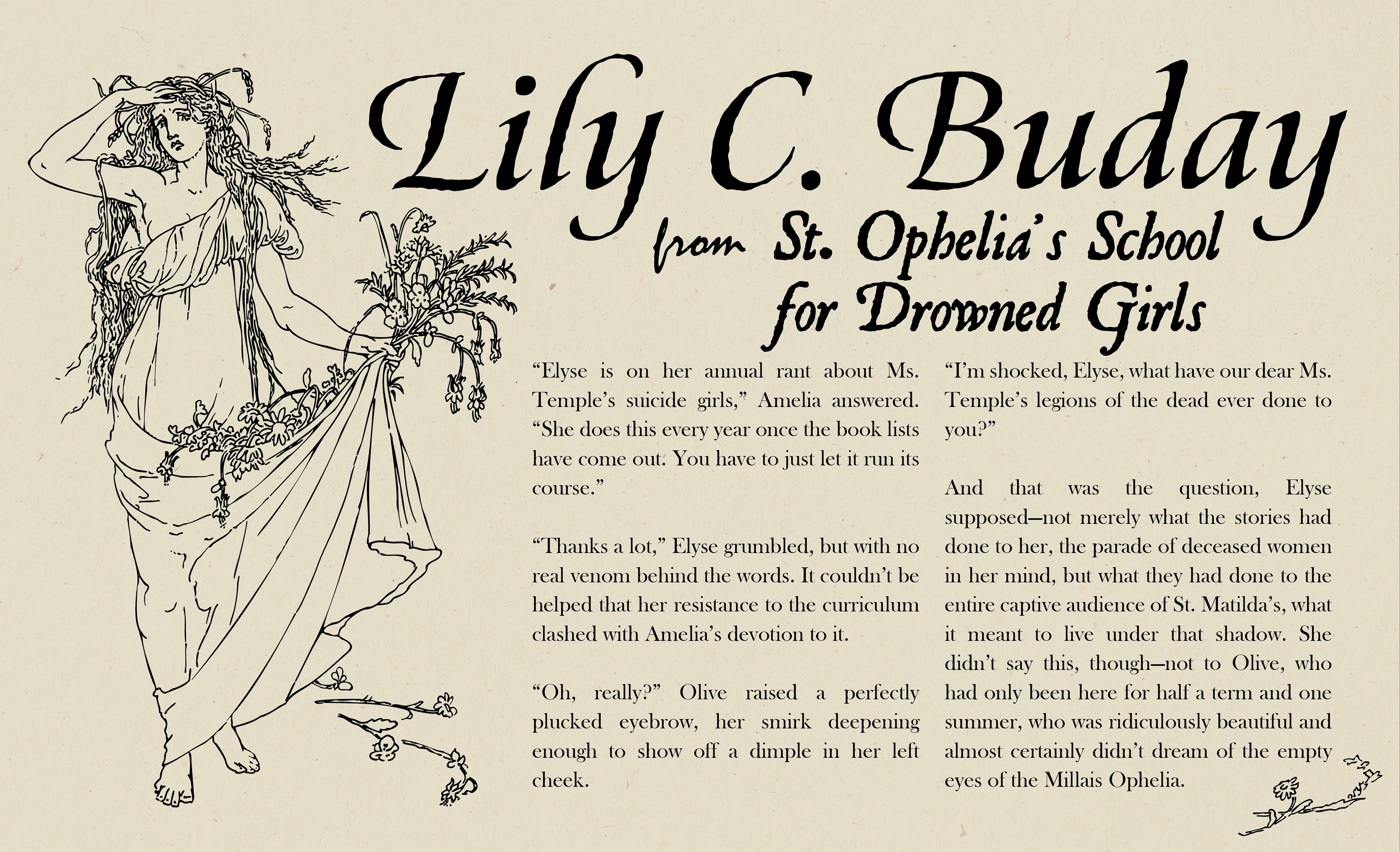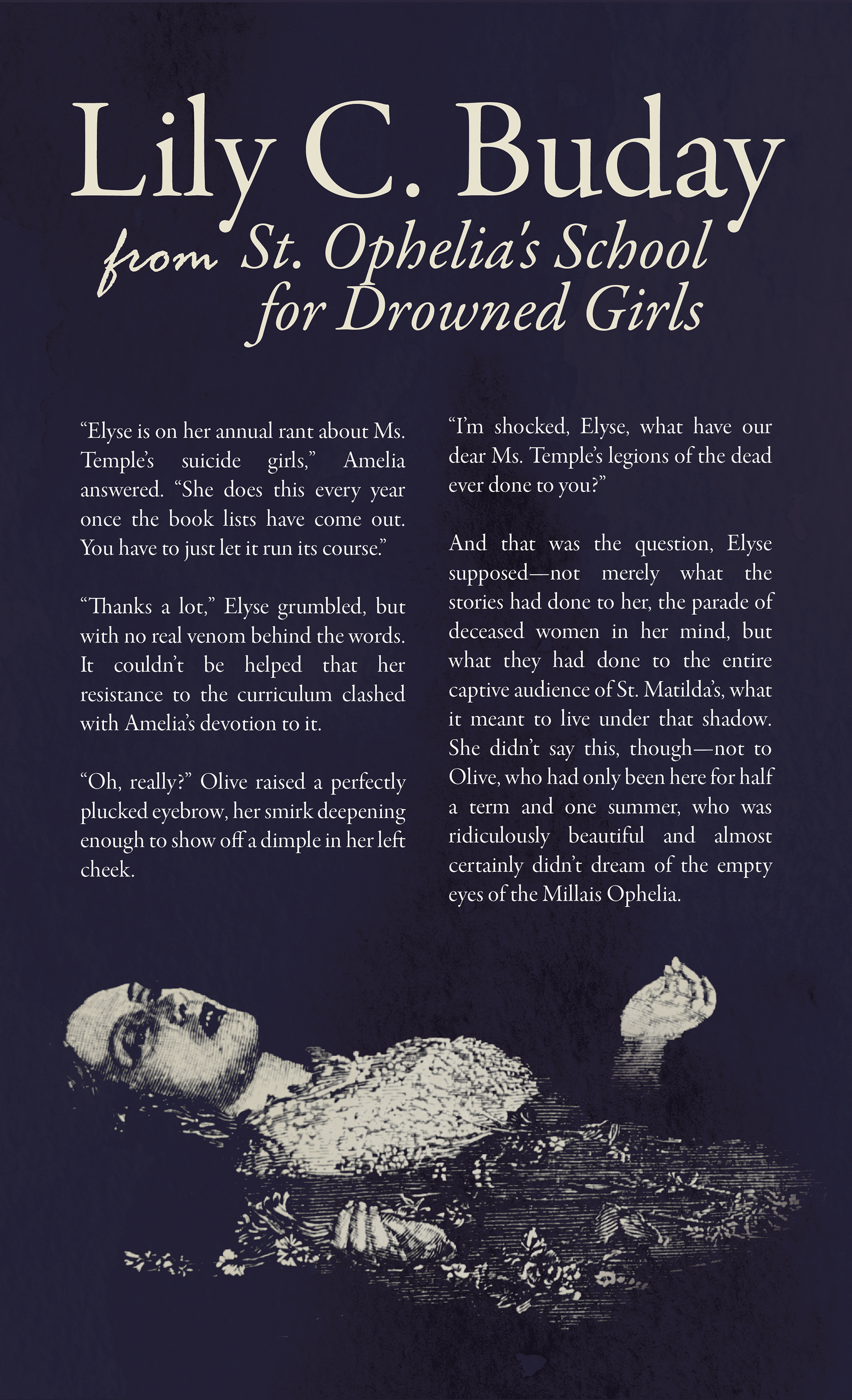 The second approach is more illustrative and simplistic, focusing again on an image of Ophelia. I added a paper-like texture in the background to evoke the academic setting of the story.